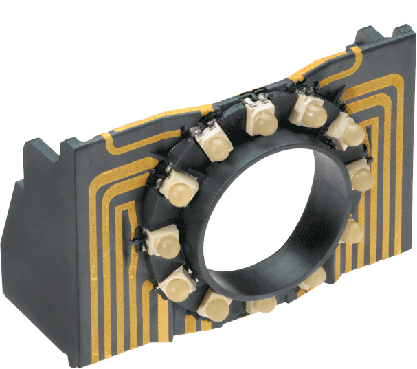 The 3D-MID LED module precisely aligns the individual LEDs to ensure complete illumination of the are to be secured. The connection of the LEDs to the main board is already integrated in the MID solution, thus drastically reducing the assembly effort.